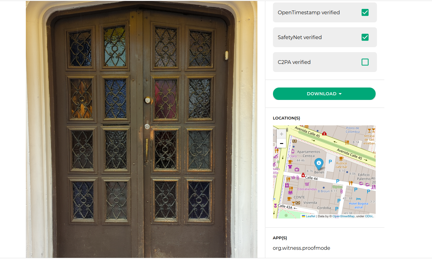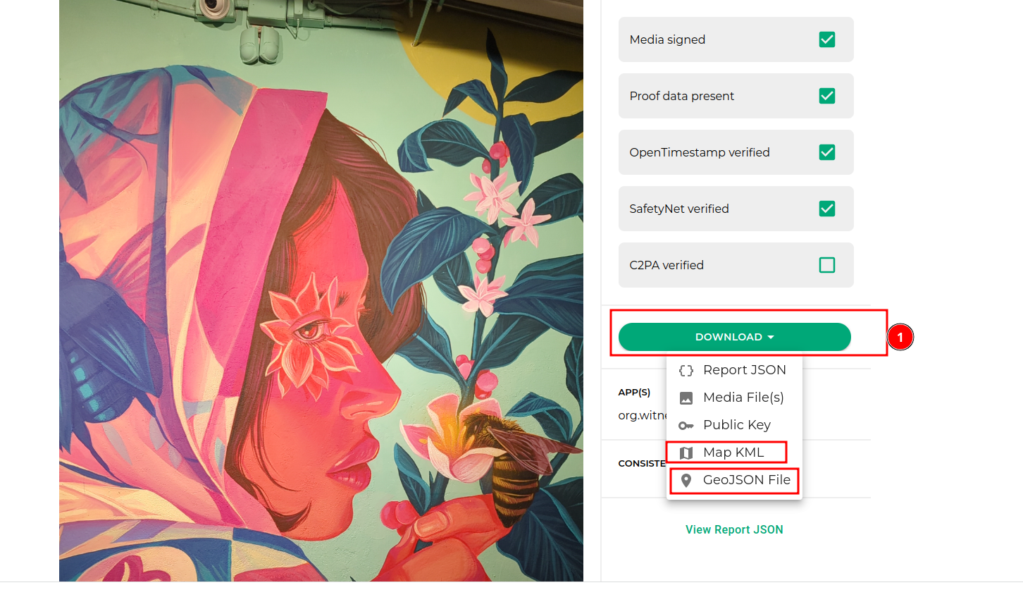 ProofCheck checks the media signatures, presence of proof data, OpenTimeStamps notarization, Google SafetyNet attestation, and will soon check C2PA verification as well! One can easily download a KML file to import into Google Earth, or a GeoJSON file for analysis.