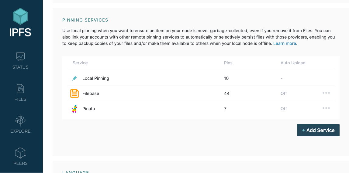 3) Setup IPFS Desktop app with one or more IPFS pinning services, such as the Filebase or Pinata services we recommend. Follow the steps here to do so