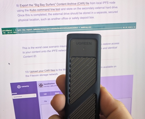 9) Export the “Big Bay Surfers” Content Archive (CAR) file from local IPFS node using the Kubo command line tool and store on the secondary external hard drive.