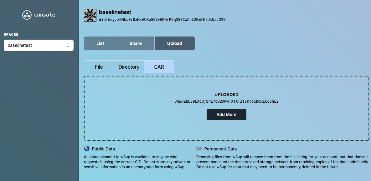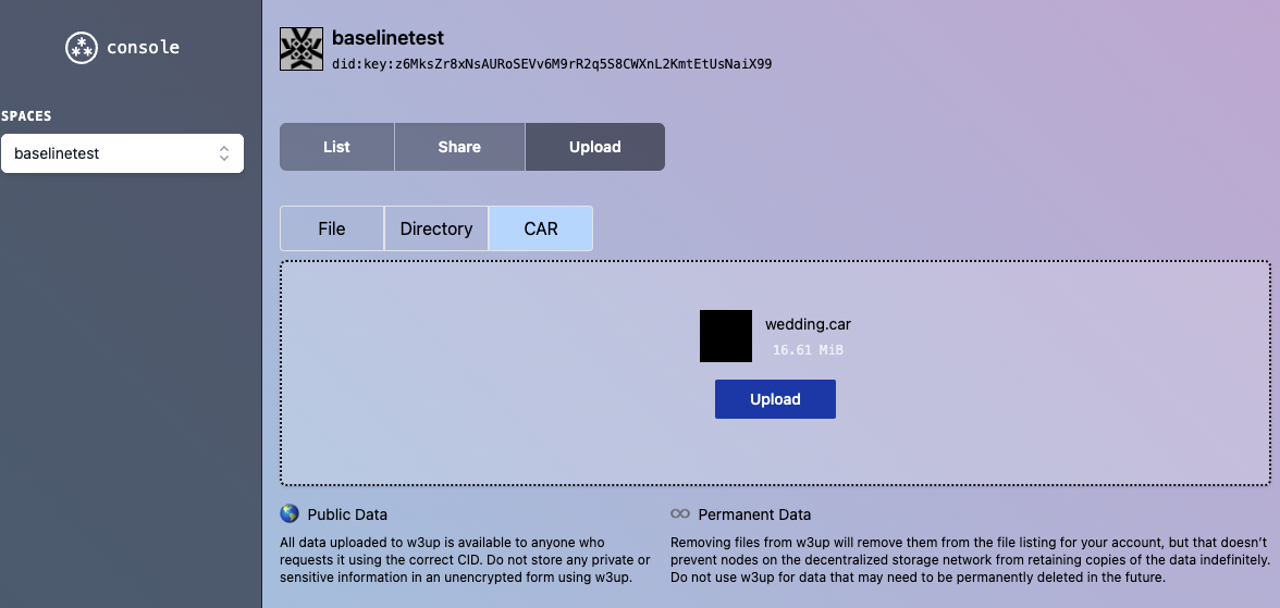 10) Upload your CAR files to the Web3.storage service to make them available on the Filecoin storage network.