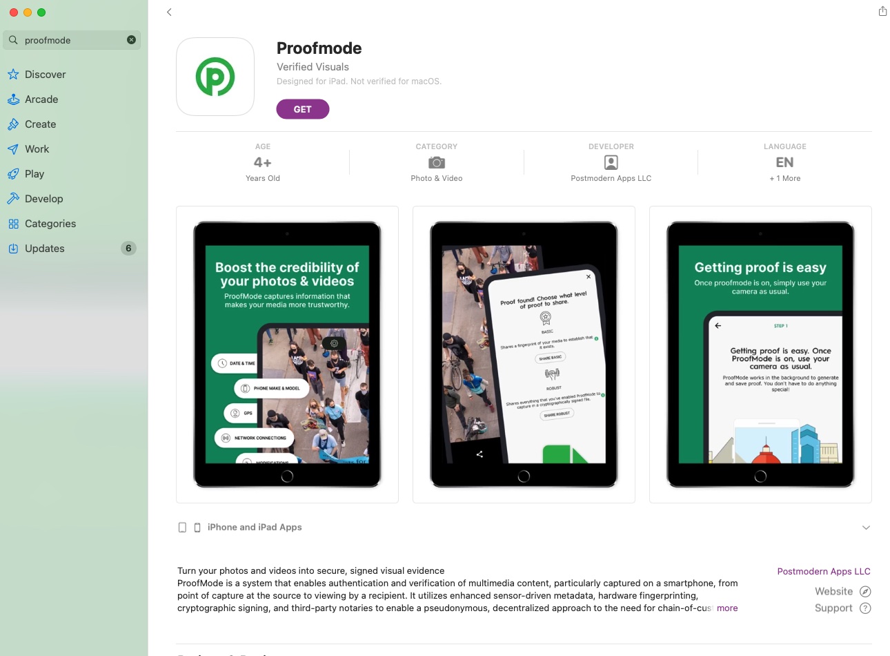 Proofmode for iOS is available on the Apple App Store for iPhone, iPad, and any Mac M1 or M2 computer.
