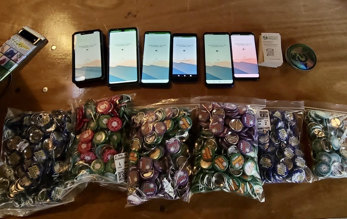 Below, phones ready to go with Proofmode loaded, sitting above bags of player badge rewards for participation!