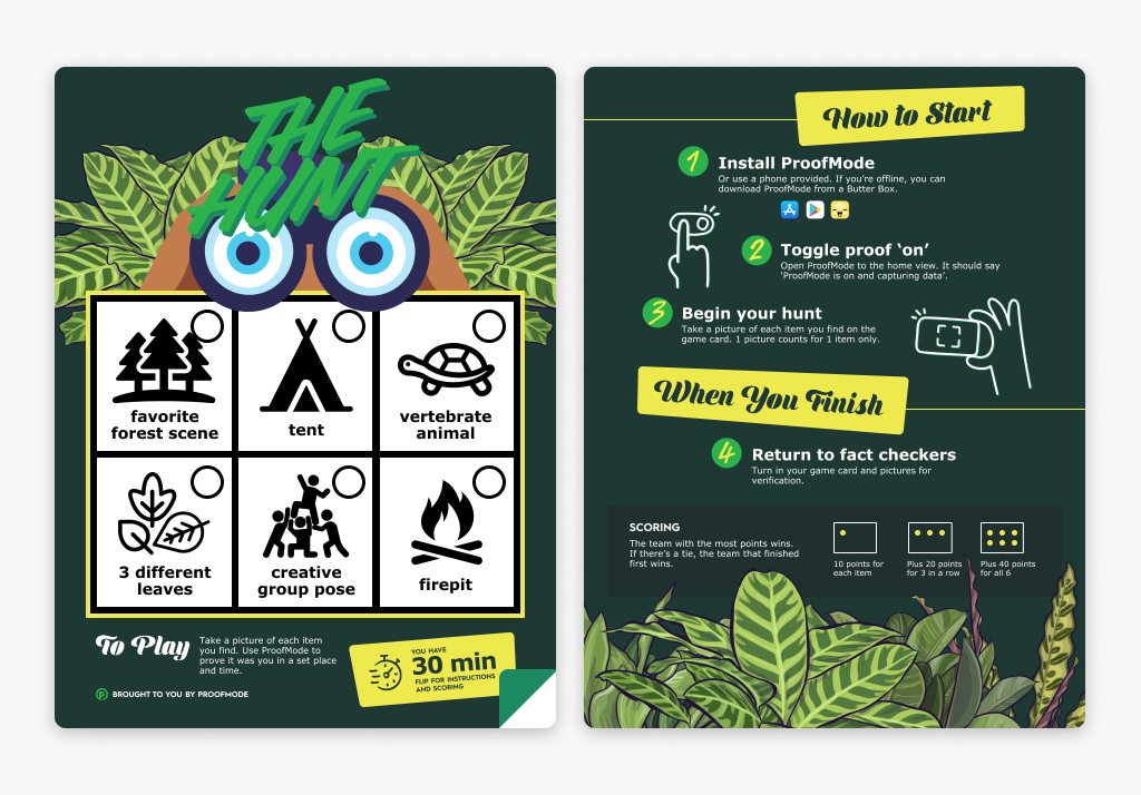We brought The Hunt to DWebCamp 2022 in the redwood forests of Northern California. This location provided a unique offline/offgrid aspect to the game, where all proof was shared through nearby hotspot micro-servers, bluetooth or Air Drop.